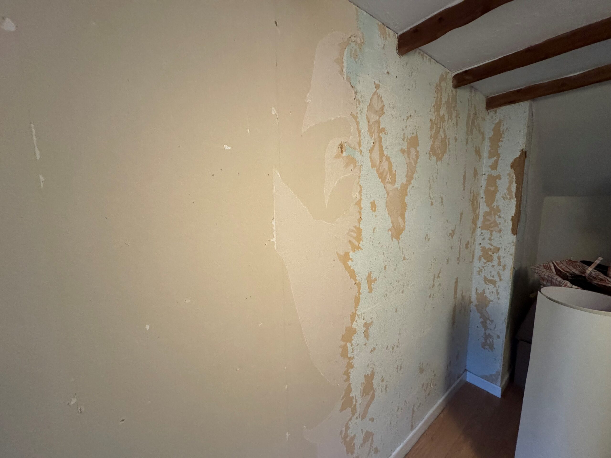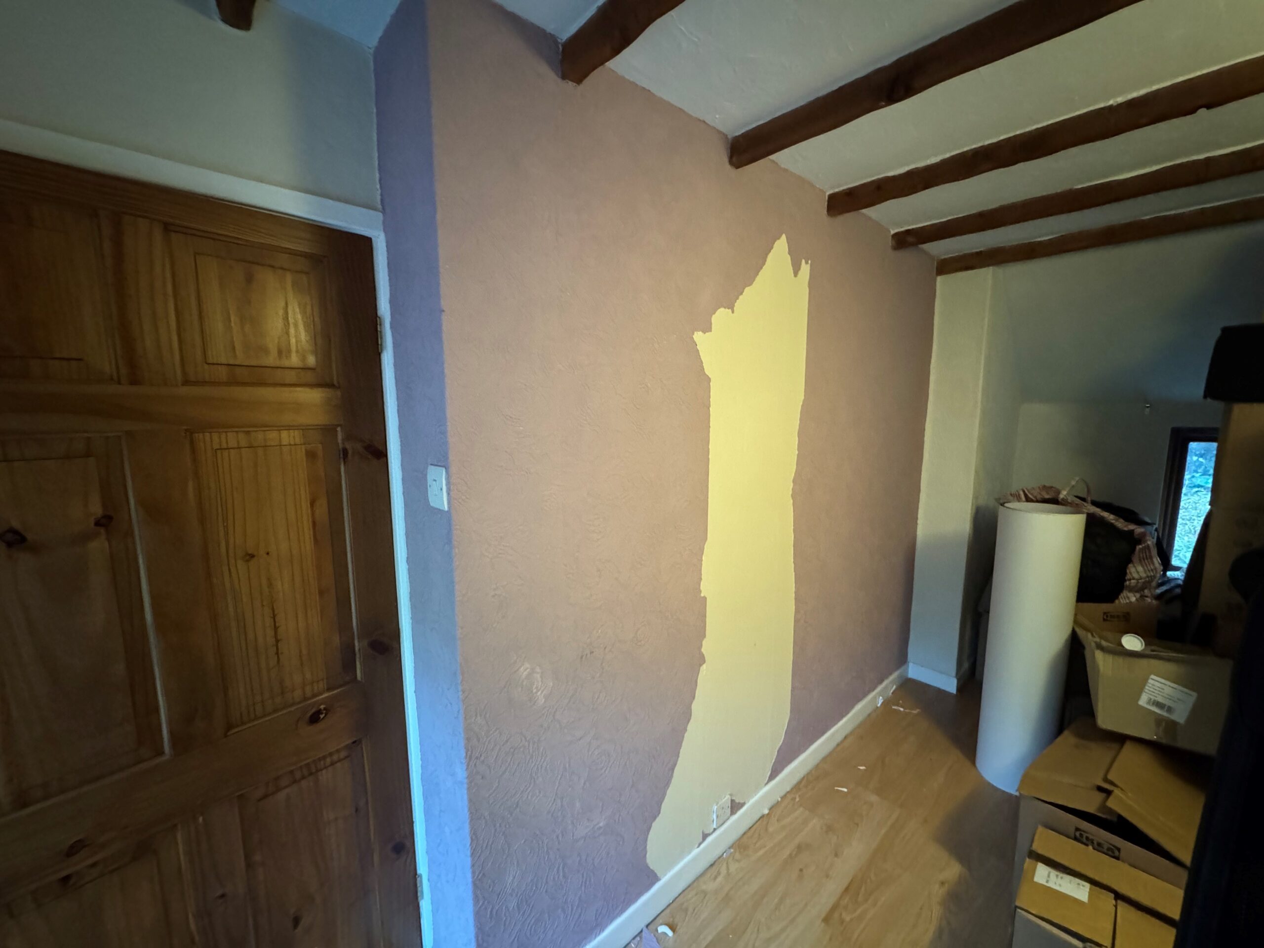Whilst we were reorganising and emptying out some of our longer term storage boxes in Bedroom 2 we decided that whilst the wall was available we would strip off the heavily textured purple painted Anaglypta wall paper to check on the condition of the stud wall underneath – it couldn’t possibly be worse than that… could it… ??