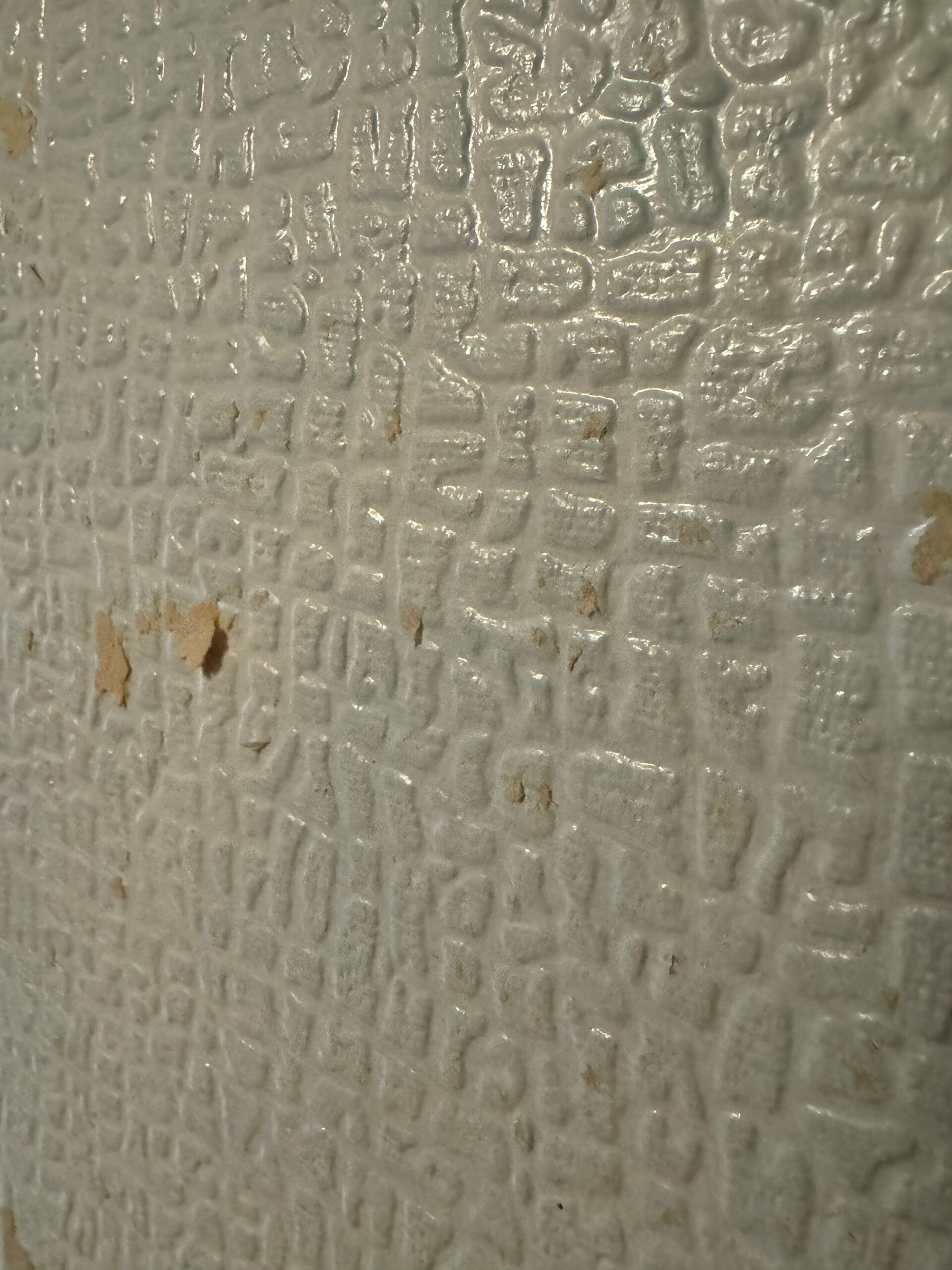 Oh dear – we certainly weren’t expecting gloss blue painted block effect paper – this stuff is SOLID and will liekly be a nightmare to remove. An added bonus is that whoever put up varois fittings in teh bathroom (which backs onto this wall), also managed to drill straight through both sides of the wall panelling into this room and we can now see the base of a few rawl plugs sticking through….