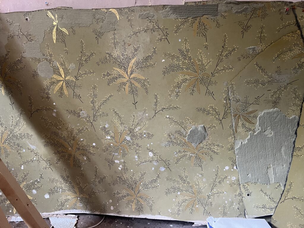 After having removed the box bed from the far wall and lifting the carpet tiles to expose the screed floor we started in on the wallpaper removal. Luckily the multiple layers were so thick that it pretty much came off in sheets – along with a thin coating of expanded polystyrene thermal insulation! This exposed some very old paper that has been provisionally dated to the 1930s and even some of the (probably) original limewash/distemper on the original lime plaster! The green shade seems to be in VERY common use in the 1920s/30s but patches of pink wash and then what could be the original light blue came to light underneath it.