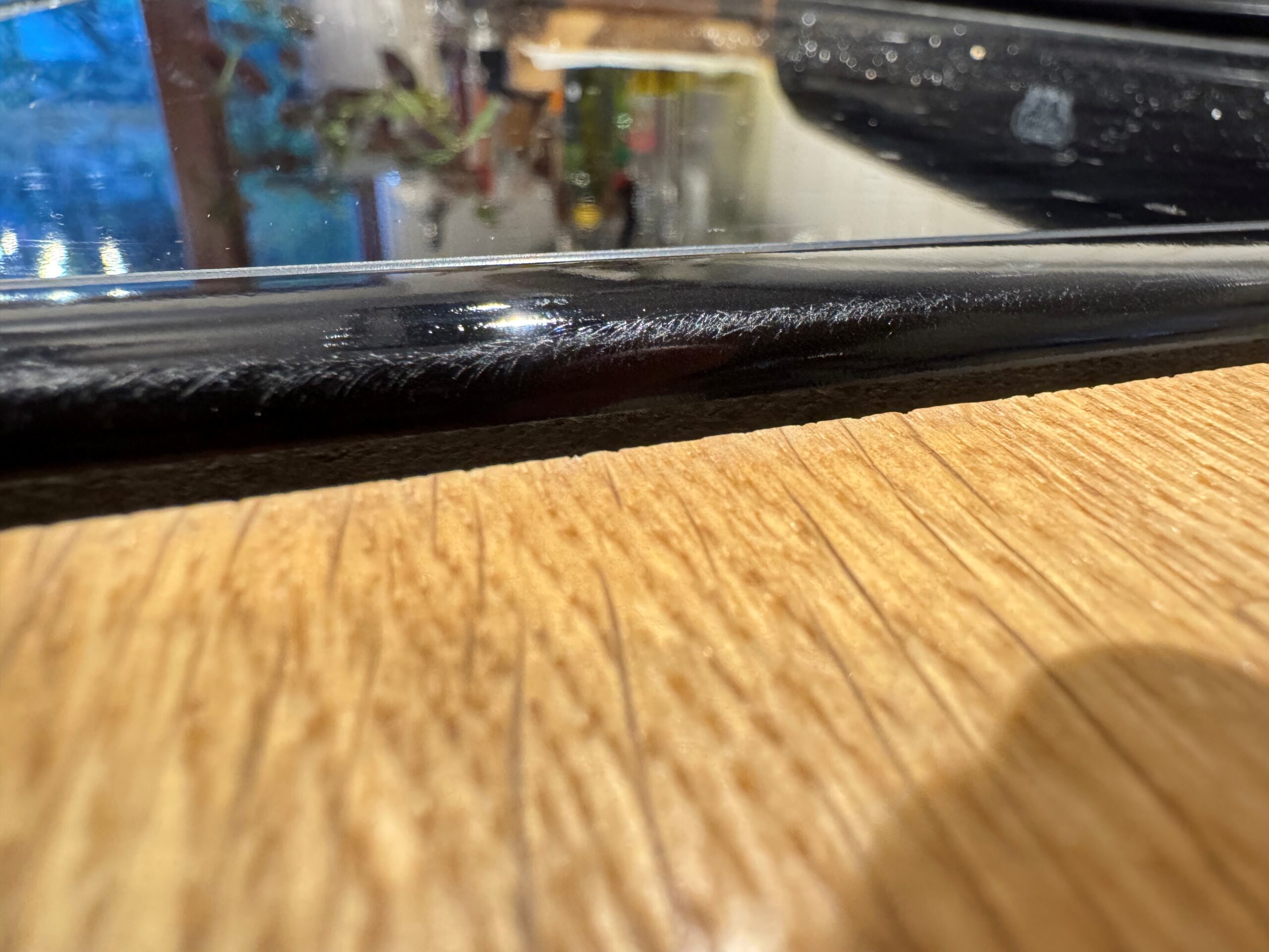 One last outstanding item… When the originally fitted wooden worktops were being removed it was discovered that they had been fitted so tightly to the cooker that the metal induction surround had been badly scuffed – this is currently with Wren warranty department for feedback as although we supplied the cooker ourselves, its sizing was built into the Wren design from the outset and was fitted at teh same time by their fitter.