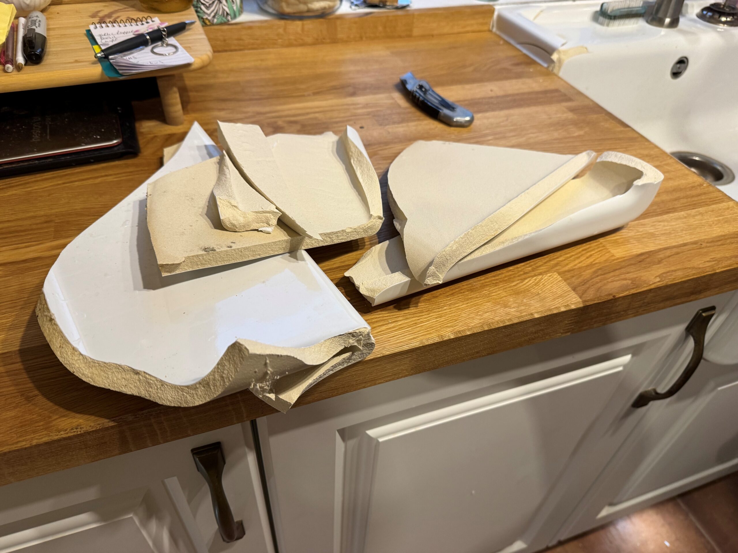 Finally, we have had a 3rd sink fitted to replace the shattered 2nd one! The broken pieces of the sink were actually just lifted out by hand as the sink had broken up that badly. Sadly, during the removal, it was also found that the 2nd fitter hadn’t sealed between the metal plug surround and the ceramic sink body and it had of course been seeping water into the wooden base unit ever since; this base unit had now blown! Another base unit was ordered under warranty and fitted on the 29th.