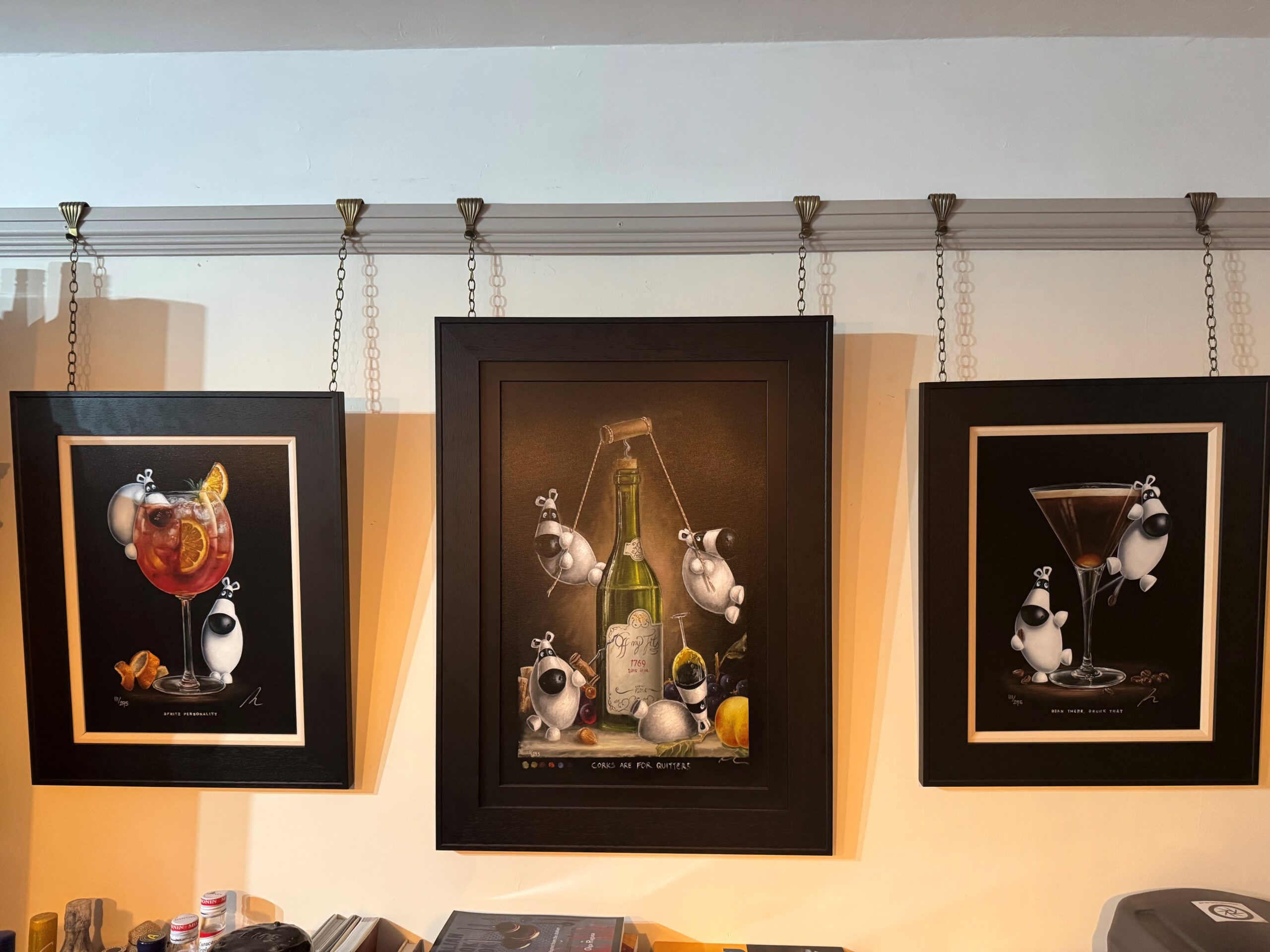 The picture rail is finally in use, and in the way it was designed to! One of Leanne’s favouriote artists is Peter Smth and a selection of his works are now in place hanging from brass hooks and chains sourced from Broughtons (as usual with our brasswear). Pete Smith‘s artwork can be found exclusivly through Castle Fine Art (we personally recommend their Stamford shop – always wine and bubbles on offer when we go in!). So far she has collected “Spritz Personality”, “Corks are for Quitters”, “Bean There, Drunk That”, “Hot Mess”, “Do Stupid Things Faster” and “Mad Catter”. We’re waiting on more hooks for “Minted” to go up too 😉