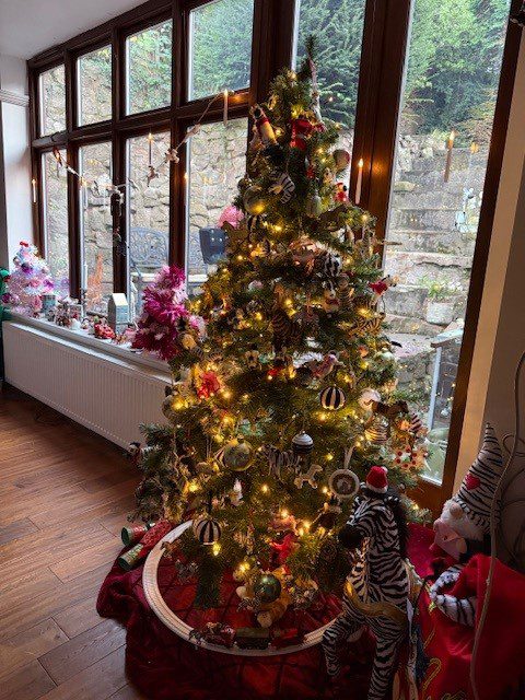 The Sun-room has been given some Christmas cheer – The tree is up!! As usual, the traditional (for us anyway), Christmas Zebra theme has arrived in force! Thsi year however there is a new addition around the foot of the tree with a USB rechargable Christmas train from Hornby! Our “Harry Potter” floating candles are adding a splash of light to the windows, just like in the adjoining Lounge.